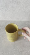 Handmade yellow stoneware mug with words: FIRST I DRINK THE COFFEE, THEN I DO THE THINGS