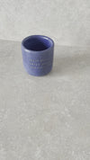 Handmade blue ceramic stoneware mug without handle with words: FIRST FIVE DAYS AFTER WEEKEND ARE THE HARDEST