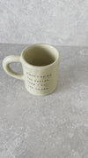 Handmade yellow stoneware mug with words: FIRST I DRINK THE COFFEE, THEN I DO THE THINGS